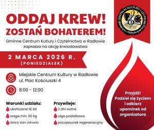 Zostań bohaterem – oddaj krew! Gminne Centrum Kultury w Radłowie organizuje akcję krwiodawstwa, która odbędzie się 2 marca 2026 r.