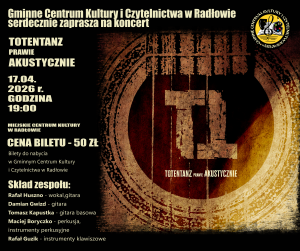 Serdecznie zapraszamy na wyjątkowy koncert „Totentanz prawie akustycznie” – nową odsłonę tarnowskiej formacji rockowej. Pomysł zaprezentowania twórczości zespołu Totentanz, znanego