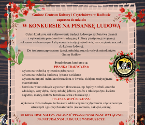 Wraz ze zbliżającą się Wielkanocą zapraszamy mieszkańców do udziału w „Konkursie na Pisankę Ludową”, organizowanym przez Gminne Centrum Kultury i